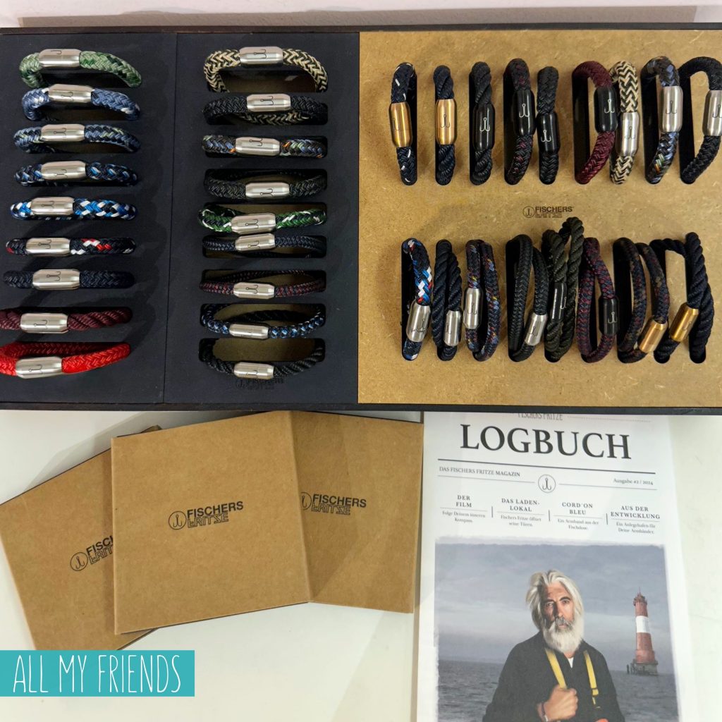 So richtig maritim: „Segeltauarmbänder mit verkapselten Edelstahl-Magnetverschluss. Erdacht und hergestellt von Fischers Fritze – zu Hause an Deinem Handgelenk.“